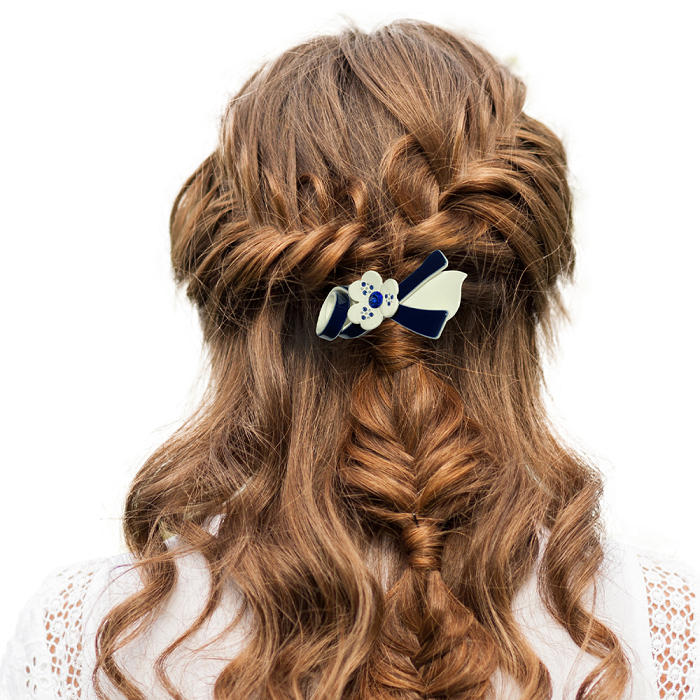 Navy Blue and Ivory Barrette with a Floral Embelishment and Deep Blue Kyanite Gemstones