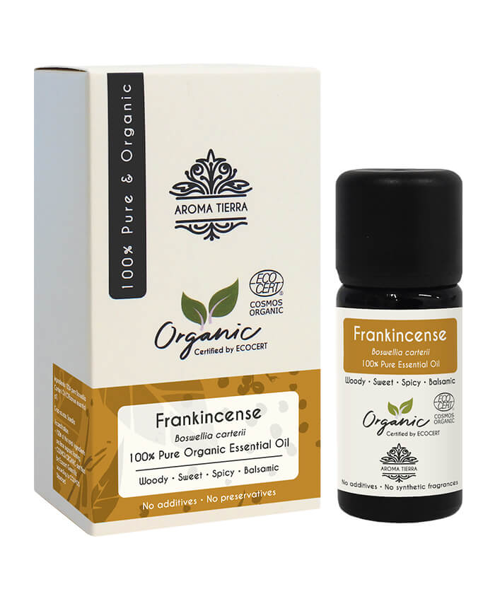 Aroma Tierra Organic Frankincense Essential oil is extracted from gum of high quality organic Frankincense tree from Somalia by steam distillation method (Boswellia carterii). It is 100% pure, natural and ‘Certified Organic’ by ECOCERT, a reputed certification body from France. It is free from chemicals, solvents, additives, synthetic fragrances and preservatives. The oil is very concentrated, potent and strong in therapeutic properties. Aroma Tierra takes great care to pack the oil in specially designed violet glass bottle to prevent damage from sunlight and preserve its potency.