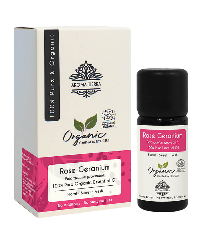 Aroma Tierra Organic Geranium (Rose Geranium) Essential oil is extracted from leaves of high quality organic Geranium plant from Egypt by steam distillation method. It is 100% pure, natural and ‘Certified Organic’ by ECOCERT, a reputed certification body from France. It is free from chemicals, solvents, additives, synthetic fragrances and preservatives. The oil is very concentrated, potent and strong in therapeutic properties. Aroma Tierra takes great care to pack the oil in specially designed violet glass bottle to prevent damage from sunlight and preserve its potency.