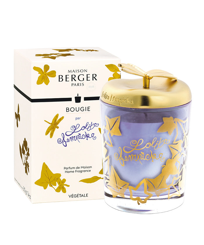 The Lolita Lempicka Scented Candle is more than a beautiful and practical object: The violet dress of its glass case is decorated with golden ivy....