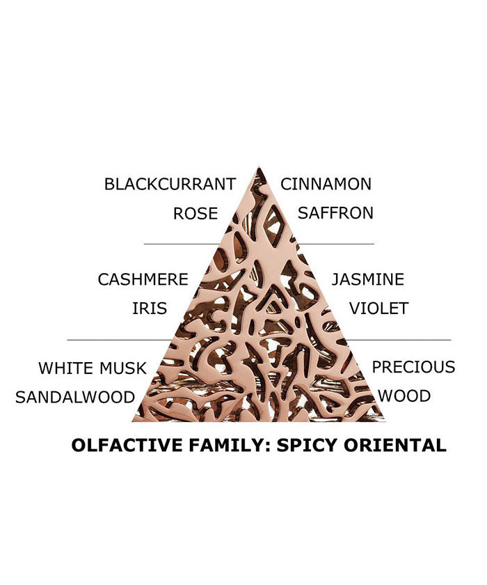 Love and boldness. This comprises the surprising duality of fruity and spicy notes, woody and floral, deep and powdered.